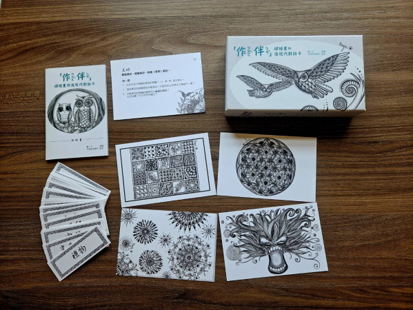 「作伴」--禪繞畫與後現代對話卡,是國內首套禪繞畫的作品,以禪繞畫結合後現代思惟文字,可以運用在自我陪伴及助人工作上。
