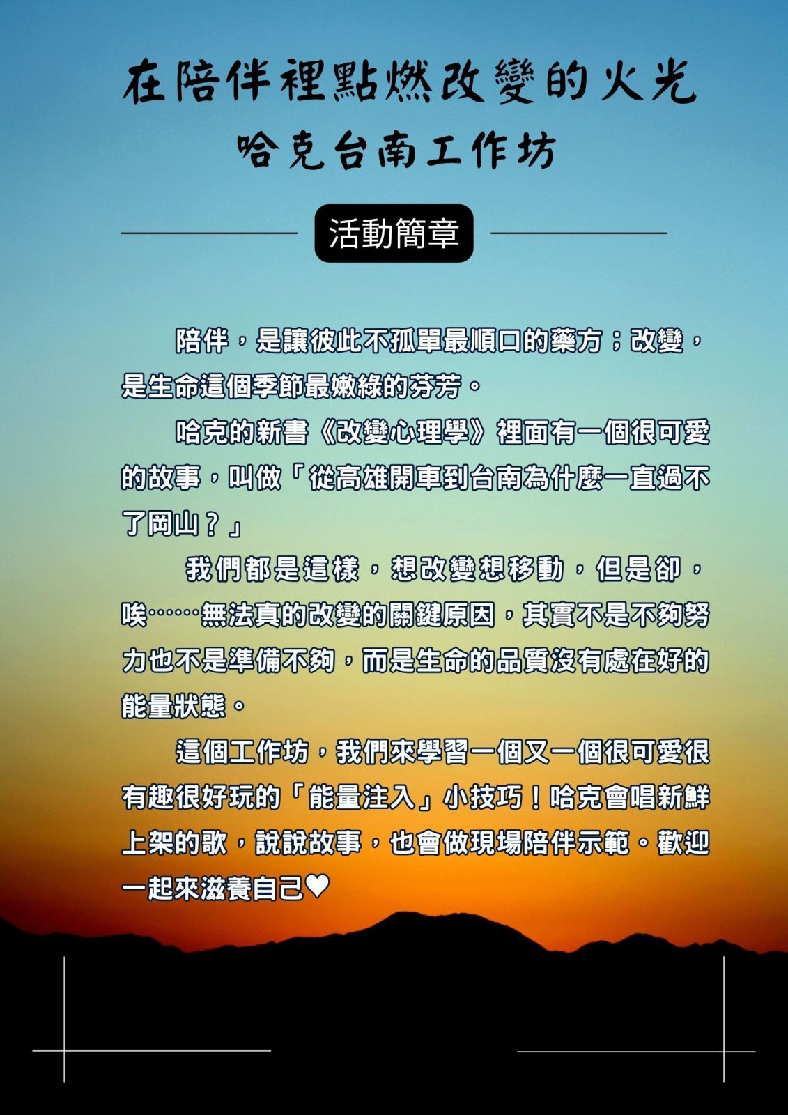「2025在陪伴裡點燃改變的火光~哈克台南工作坊」--開始報名囉!